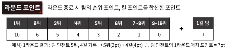 각 라운드에 순위/킬에 따라 라운드 포인트를 획득합니다.